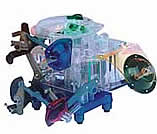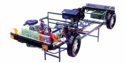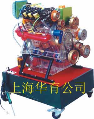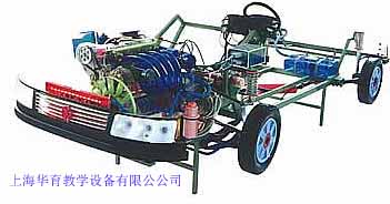 本品選用透明有機玻璃制作,內中部件均以硬質塑料料加工,用 螺絲固定在金屬高溫烘漆而成的車架上。各總成部分都以壓模成形加 工,代替過去膠粘合的方法,使產品在強度上有很大提高。發動機總成用電機驅動,在油門處設有調速裝置,能演示發動機轉速高低。離合器分離明顯,操縱靈活,離合器外殼整體壓模而成,變速箱和各檔齒輪用各種顏色表示,換檔靈活,手制動美觀。后橋外形壓模而成,內中主減速、差速轉動自如,輪轂剎蹄壓模成型,剎蹄可調節,前橋輪鼓可調整,轉向裝置以及電瓶、油箱、水箱,制動管路分布清楚一目了然。電路采用對插件前后分布,燈架、風窗、儀表板、后燈架用透明有機玻璃壓模成整體美觀逼真。