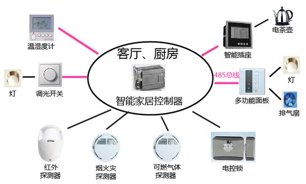 智能電子產品系統網絡示意圖 1. 家庭控制中心說明: 客廳廚房控制中心 客廳廚房控制中心包含智能家居控制器、電控鎖、多功能面板、節能燈、排氣扇、智能調光開關、智能光強及溫濕度計、智能插座、電茶壺、可燃氣體探測器、煙火災探測器及紅外探測器。 電控鎖通過智能家居控制器控制門的開啟;多功能面板控制客廳、廚房燈的開關;智能調光開關調節LED燈的亮度、也可通過485總線與智能家居控制器通訊,通過情景模式智能調節LED燈的亮度;智能光強及溫濕度計顯示采集客廳溫濕度及光照度;智能插座控制和采集電茶壺的電源和電量信息,可合理分配用電負荷;可燃氣體探測器、煙火災探測器及紅外探測器用于組件家居系統的安防系統。 多功能面板、智能調光開關、智能光強及溫濕度計、智能插座通過485總線與智能家居控制器通訊,可燃氣體探測器、煙火災探測器、紅外探測器及電控鎖通過I\O口與智能家居控制器通訊。