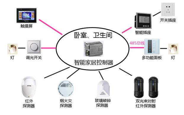 智能電子產品系統客廳廚房安裝配置圖 臥室衛生間控制中心 臥室衛生間控制中心包含智能家居控制器、觸摸屏、多功能面板、智能調光開關、智能插座、煙火災探測器、紅外探測器、玻璃破碎探測器、雙光束對射紅外探測器。 觸摸屏通過485與智能家居控制器通訊,可實現遙控、遙信、遙調及情景模式的設定;智能調光開關調節白熾燈的亮度、也可通過485總線與智能家居控制器通訊,通過情景模式智能調節白熾燈的亮度;多功能面板控制臥室、衛生間燈的開合;智能插座控制和采集相關用電設備電源和電量信息,可合理分配用電負荷;煙火災探測器、紅外探測器、玻璃破碎探測器、雙光束對射紅外探測器用于組件家居系統的安防系統。 觸摸屏、多功能面板、智能調光開關、智能插座通過485總線與智能家居控制器通訊,煙火災探測器、紅外探測器、玻璃破碎探測器及雙光束對射紅外探測器通過I\O口與智能家居控制器通訊。